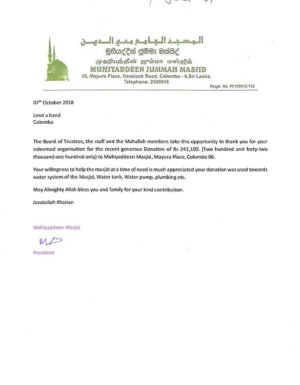 Lend A Hand assisted Mohiyadeen Masjid in Colombo 05 by providing a water tank, water pump, and plumbing at a cost of Rs. 242,100/-.